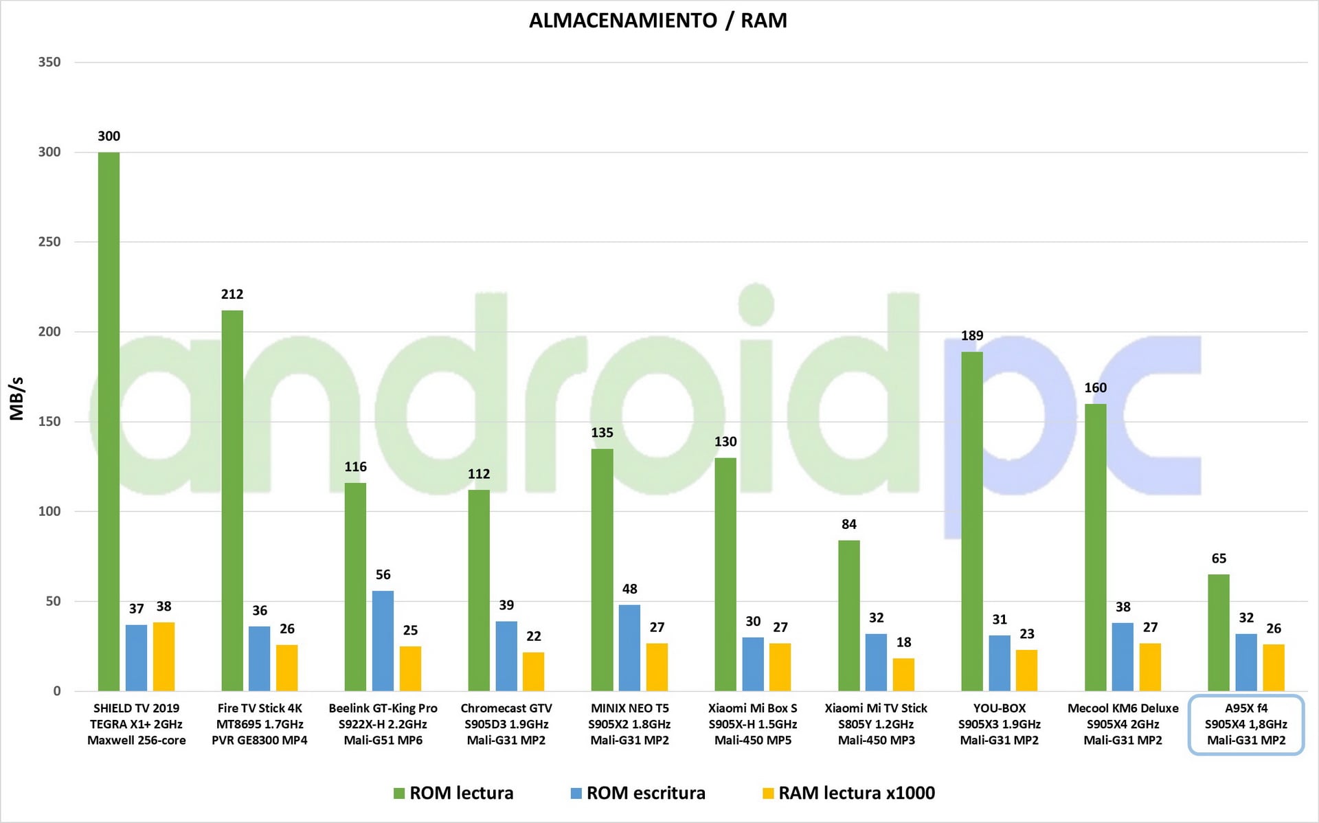 En el apartado de rendimiento el A95X F4 cuenta con el SoC Amlogic S905X4 Quad Core con procesadores ARM Cortex-A55 limitado a 1.8GHz, en el apartado gráfico cuenta con una GPU Mali-G31 MP2 de gama media. Este SoC es una mejora del anterior S905X2 y es muy similar al anterior S905X3. Como muestran los resultados tenemos un buen rendimiento por el conjunto hardware y el rendimiento de este nuevo SoC de AMLogic, queda igualado frente al nuevo Googlecast TV y supera por bastante al Xiaomi Mi Box que ya está algo desfasado en comparación.
