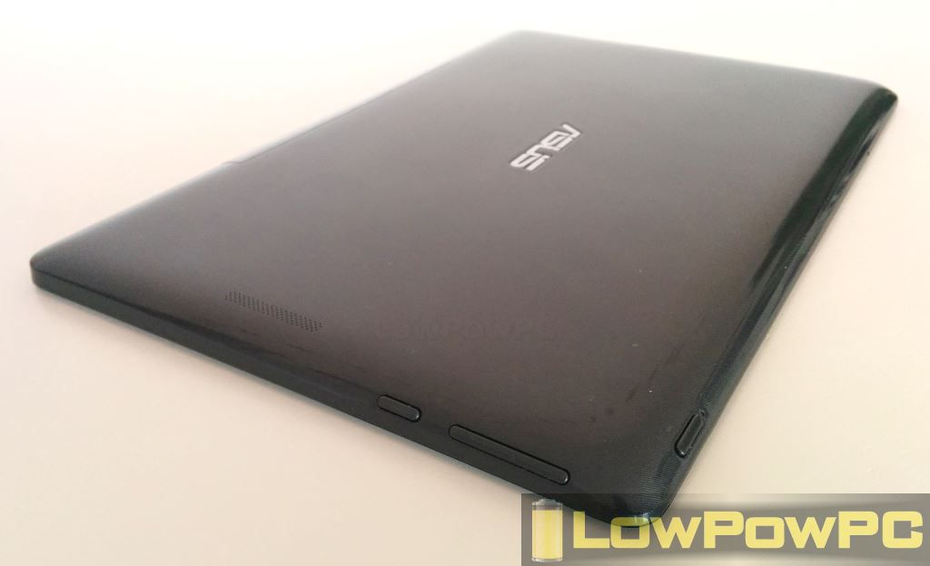 En el extremo contrario al de los botones de volumen tenemos los conectores, contamos con salida microHDMI, conector microUSB por donde recargamos la tablet, jack de audio que cumple las funciones de entrada/salida y una ranura para tarjetas de memoria microSD. El acabado de la tapa trasera es en plástico brillante con rayas finas y el logo de ASUS metálico.