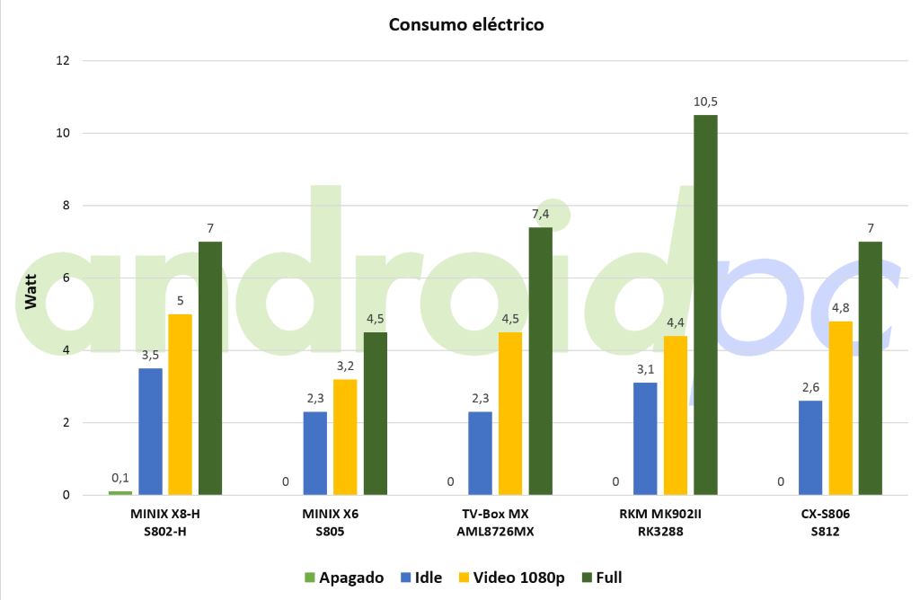 En cuanto al consumo tenemos los mismo valores que en el SOC padre S802 unos consumos bastante contenidos. El TV-Box no se calienta en exceso aunque este encendido durante bastante tiempo.