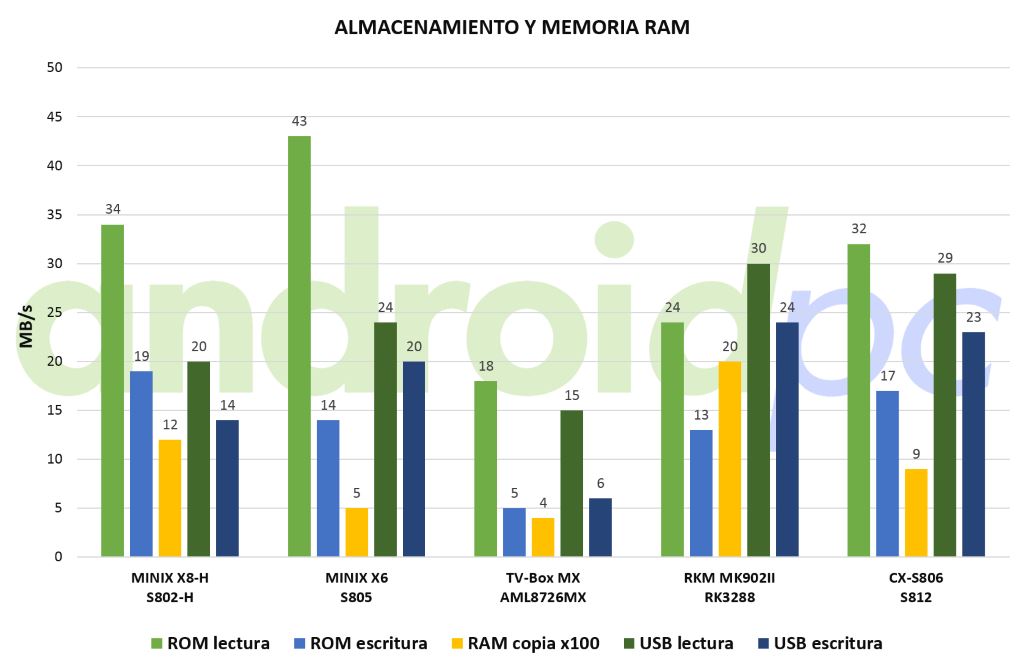 Como podemos ver en nuestro test de rendimiento de memorias el dispositivo esta en la linea de la gama media de TVBox, la memoria se comporta con normalidad y hemos podido instalar y borrar datos sin problemas.
