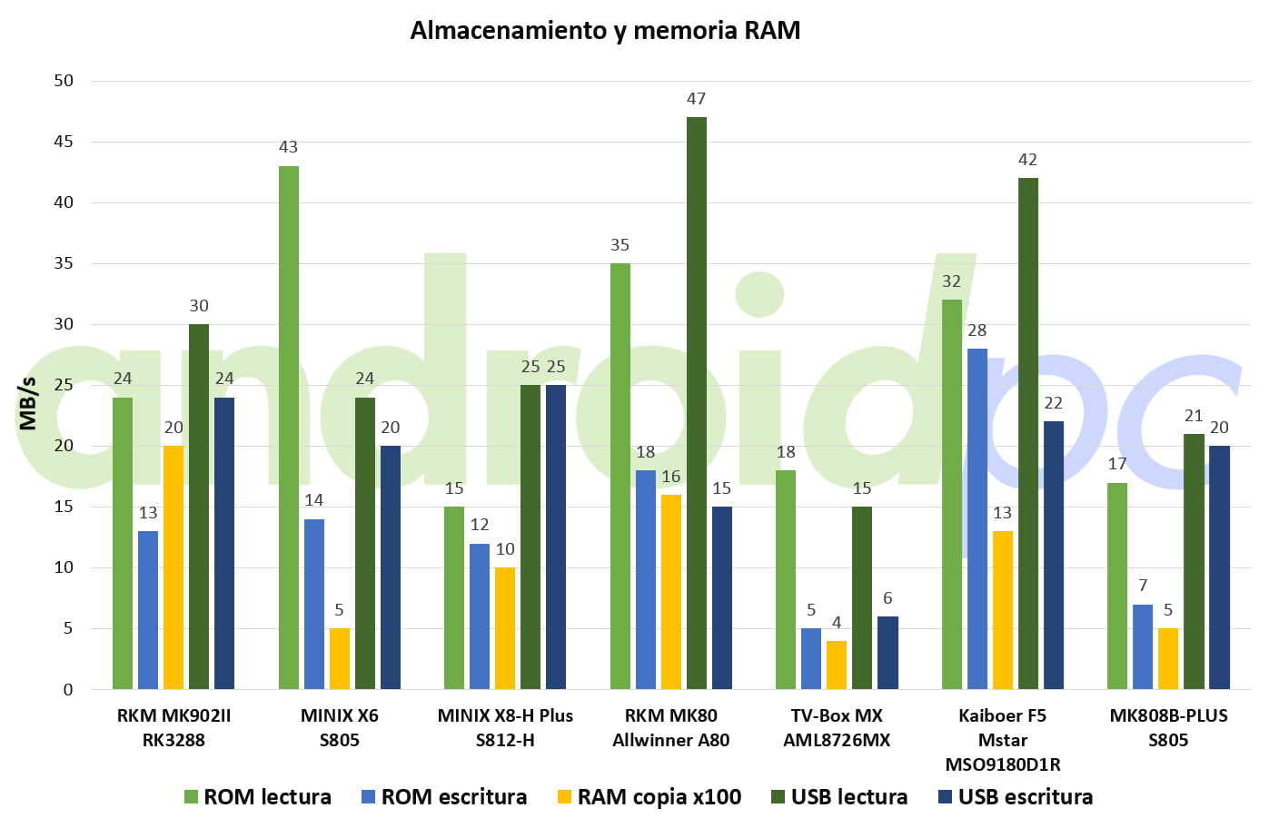 Para los test de la memoria y el almacenamiento interno usamos el habitual SD bench para poner a prueba tanto la memoria RAM como la memoria NAND de almacenamiento. Los resultados de este equipo están en la parte baja, algo que esperábamos en un equipo de bajo precio que monta memorias de baja velocidad.