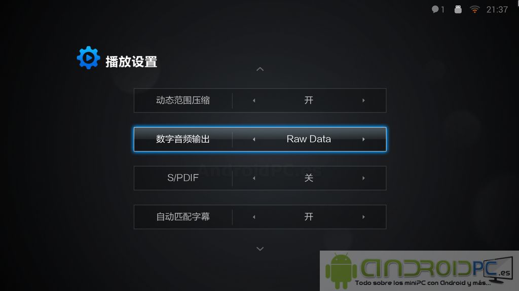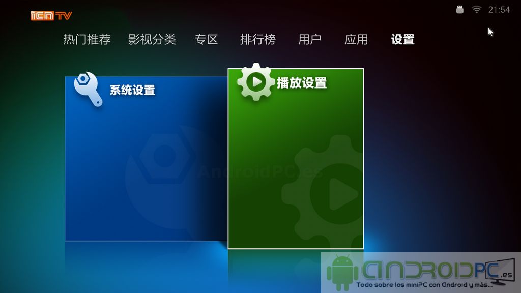 En el ultimo menú de el launcher chino tenemos la sección de ajustes, hay dos zonas diferentes una con un icono de una llave inglesa que nos lleva a los ajustes generales del box y otra con un icono de ruda dentada que nos lleva a ajustes de reproducción del dispositivo.
