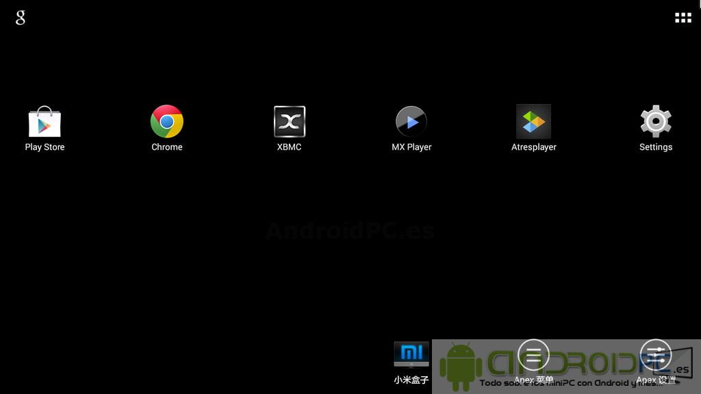 En nuestro caso hemos instalado Apex launcher. Pulsamos la tecla HOME del mando y podremos arrancarlo, podemos ver que el sistema Android viene por defecto en chino pero se puede cambiar a ingles con lo cual tocar la configuración del sistema es relativamente sencillo. En los ajustes de Android también podemos cambiar el launcher por defecto a Apex launcher por ejemplo. Además de este escritorio podemos añadir la app Full!Screen y así tener el botón home y atrás en pantalla lo que mejora mucho la usabilidad.