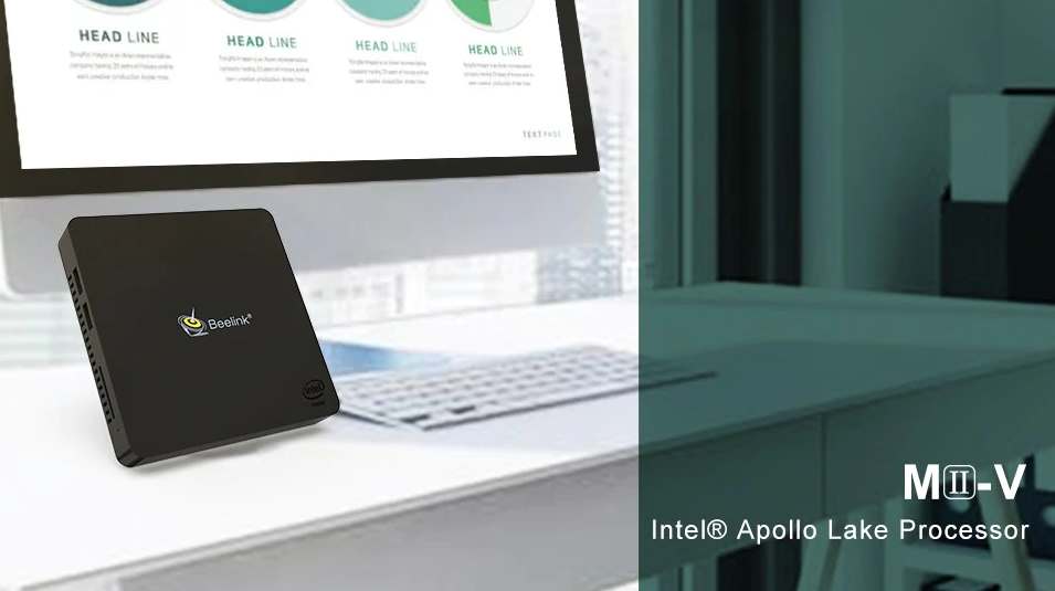El mini PC de bajo consumo Beelink MII – V incluye procesadores Apollo lake fabricados en 14nm y refrigerados por un ventilador, los Intel Celeron N3350 Dual Core o Celeron N3450 Quad Core, ambos con una GPU Intel HD Graphics 500 suponemos refrigerado por un ventilador. También tiene en placa 4GB de RAM LPDDR4 no ampliables, 64/128GB de memoria de almacenamiento eMMc y un puerto libre donde instalar un SSD del tipo M.2 2242.