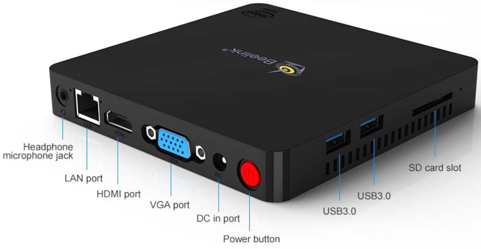 Para redes inalámbricas el miniPC Beelink MII – V incluye WiFi aC de Doble Banda y Bluetooth 4.0. A nivel de puertos encontramos 4 puertos USB 3.0, jack de audio 3,5mm, lector de tarjetas SD, puerto de Ethernet Gigabit, VGA y un HDMI 1.4b con una resolución máxima 4K a 30fps.