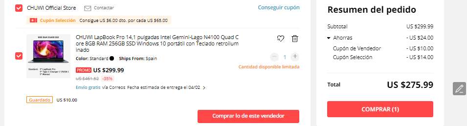 • Chuwi LapBook Pro se puede comprar en Aliexpress.com en oferta por solo 253,88€ (275,99$) con envío gratis desde ESPAÑA y CHINA utilizando los cupones selección y de vendor que da la misma tienda.