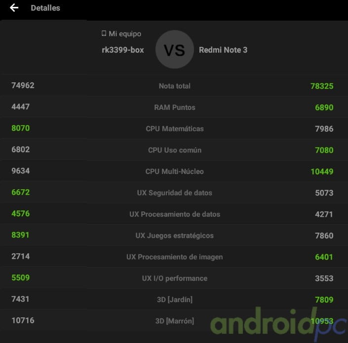 Si comparamos los datos del TV-Box RK3399 contra un Redmi Note 3 que monta un Qualcomm Snapdragon 650 (MSM8956) vemos que queda bastante cerca en rendimiento general.