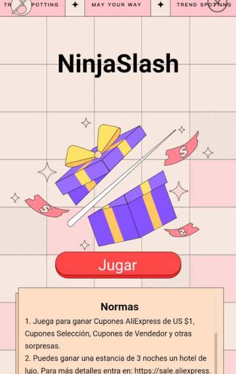 • Paralelamente en Aliexpress también tenemos activo un Juego llamado NinjaSlash, donde al estilo Ninja Fruit tenemos que cortar cajas de regalos para poder conseguir diferentes cupones descuento, selección o válidos para todo aliexpress.
