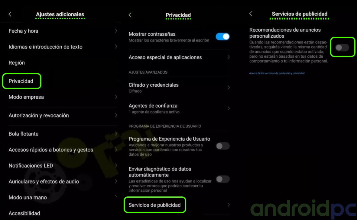 - Ajustes > Privacidad y seguridad > Desmarcar Servicio personalizado.