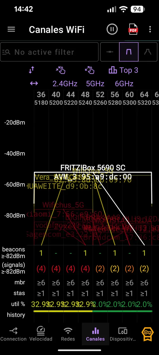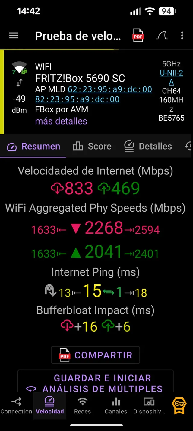 Comprobamos la cobertura usando el FRITZ!Box 5690 XGS activando el Wi-Fi 7 en las dos bandas 2,4GHz y 5GHz. El resultado en general es muy bueno y aquí sí que se percibe una mejora muy grande respecto a otros routers sencillos con Wi-Fi 5. Situándonos en el punto más alejado de nuestra casa, la transmisión de datos es buena, se nota la configuración MIMO 4×4, la potencia de las antenas y los amplificadores que monta este router son de calidad.
