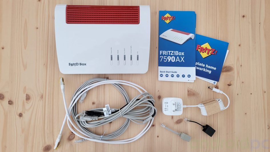 Como vemos el Fritz!Box 7590 AX nos llega en una caja de cartón con una imagen del Router en la parte superior, dentro encontramos el dispositivo junto con el manual, adaptador de corriente y varios cables.