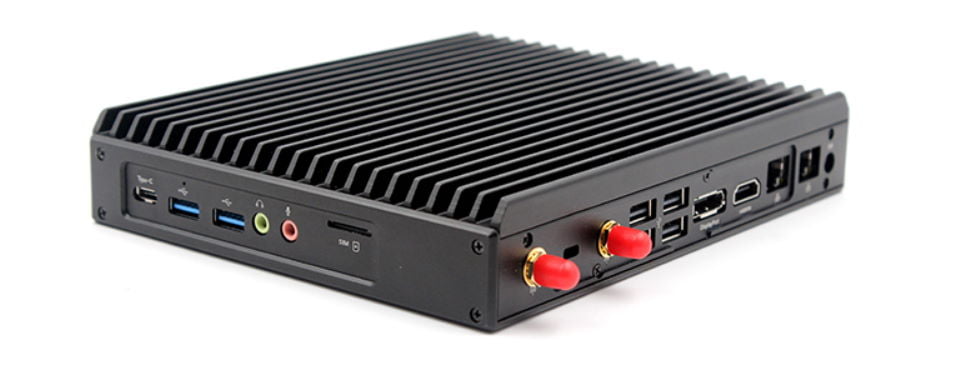 Dentro de este miniPC contamos con un adaptador WiFi a/b/g/n Dual Band y Bluetooth 4.0 para conectividad inalámbrica con dos conectores para antenas externas. En el perímetro de la caja tenemos 4 puertos USB 2.0, dos USB 3.0, USB Type-C, un jack de audio de 3,5mm, puerto RS232 COM, dos puertos de red Gigabit, un puertos HDMI 2.0 con soporte 4K@60 HDR, otro DisplayPort y bloqueo Kensington. Este mini PC es compatible con Windows 10 y Linux.