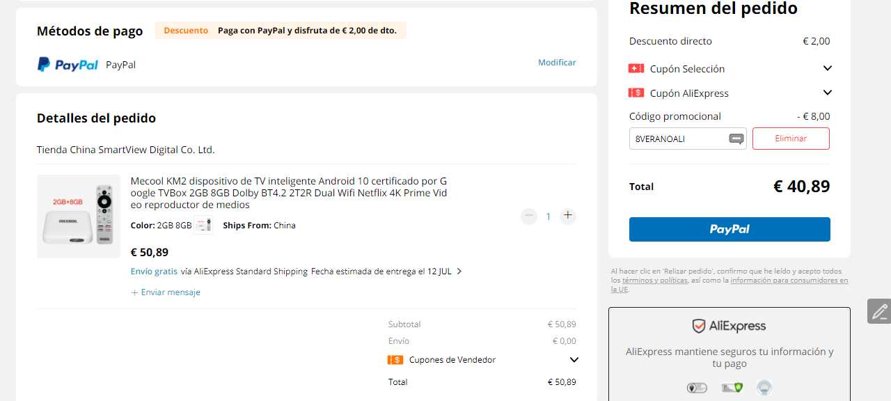 • El Smart Box Mecool KM2 se puede comprar en Aliexpress.com por 40,89 € (49 $) con envío gratis utilizando el código descuento 8VERANOALI y pagando con PAYPAL