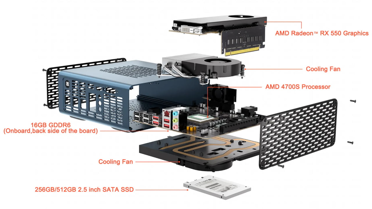 Este mini PC con un procesador AMD 4700S con núcleos Zen 2, un Octa Core con 16 hilos y como decimos integra la GPU de Playstation 5 desactivada. Como solución gráfica tenemos un AMD Radeon RX 550 que ofrece un rendimiento bastante bajo. La caja de este pequeño ordenador monta un doble ventilador sobre el procesador y en la parte inferior.