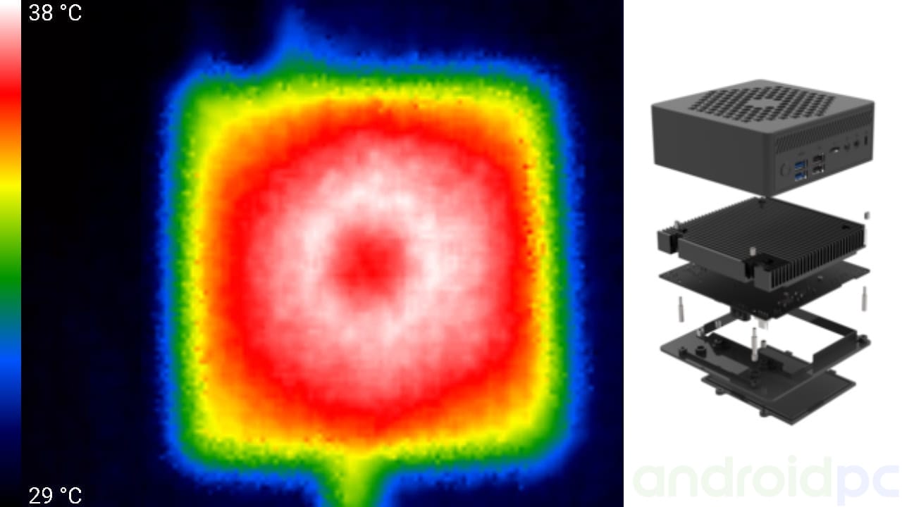 Este ordenador nos da un buen rendimiento térmico el conjunto del hardware se mantiene las temperaturas controladas gracias as su gran disipador superior y no emite ruido, la superficie superior se calienta como es normal en este tipo de PC fanless. Este procesador con sus 10 nm es eficiente y no nos debe preocupar en este aspecto.