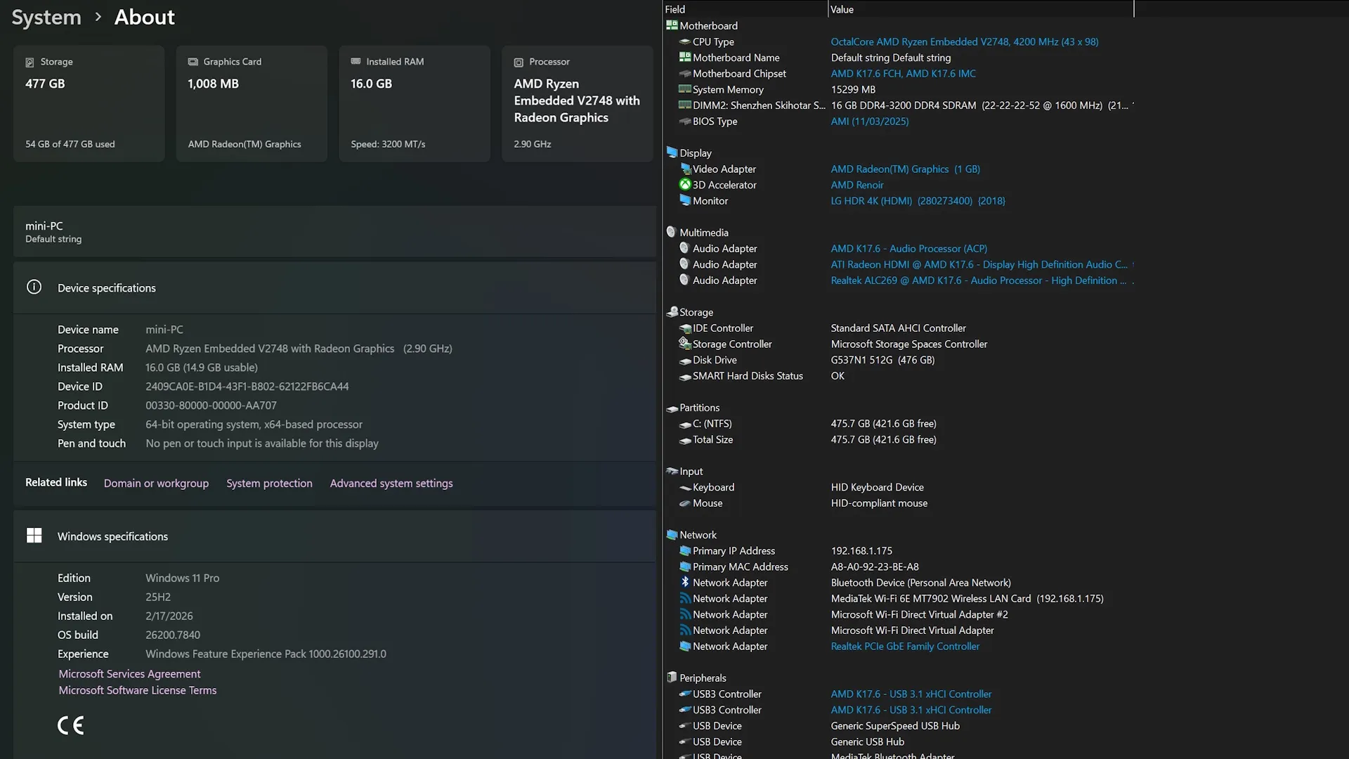 En la caja del compacto NIPOGI E3B tenemos un peculiar procesador destinado normalmente al sector industrial, se trata del AMD Ryzen Embedded V2748 Octa core fabricado en 7 nm. Disponemos también de dos SODIMM RAM DDR4 3200 MHz, para almacenamiento, dos ranuras para SSD NVMe, conectividad Wifi 6E de alta velocidad y hasta dos salidas de vídeo. El sistema operativo instalado es Windows 11 Pro y es compatible también con Linux.