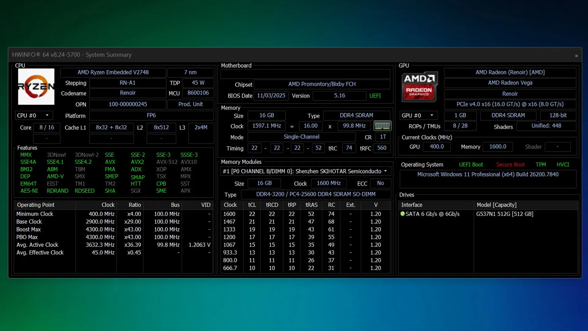 - RAM: 16 GB DDR4 3200 MHz / 2x SODIMM.