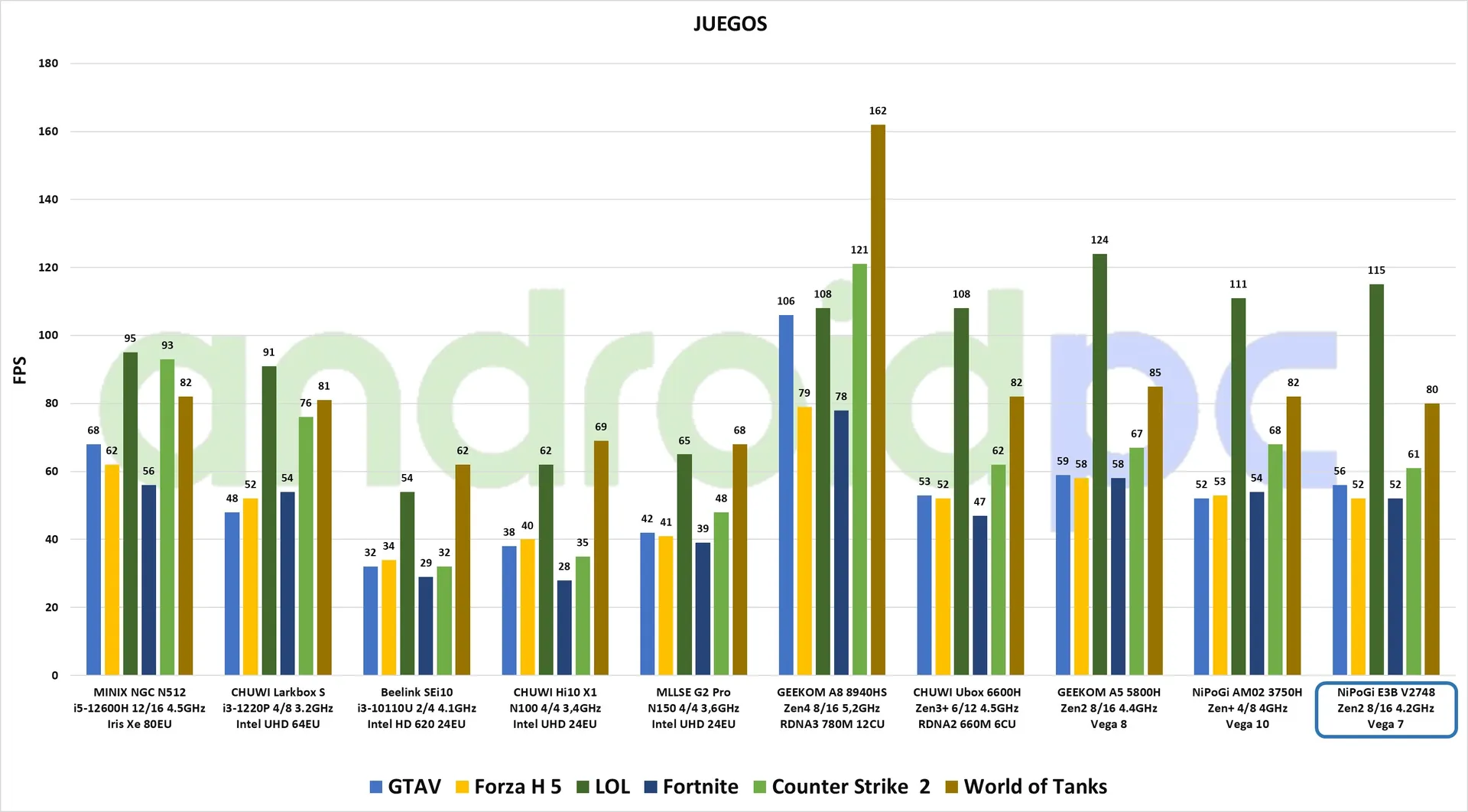 Este mini PC podemos jugar a títulos como LoL con alta tasa de frames, en títulos más exigentes como Fornite ajustando settings o en modo rendimiento con RAM en Dual Channel se puede jugar a mínimos. En cuanto a emuladores, como máximo nos quedamos en algunos títulos demandantes de PS3, Switch y similares.