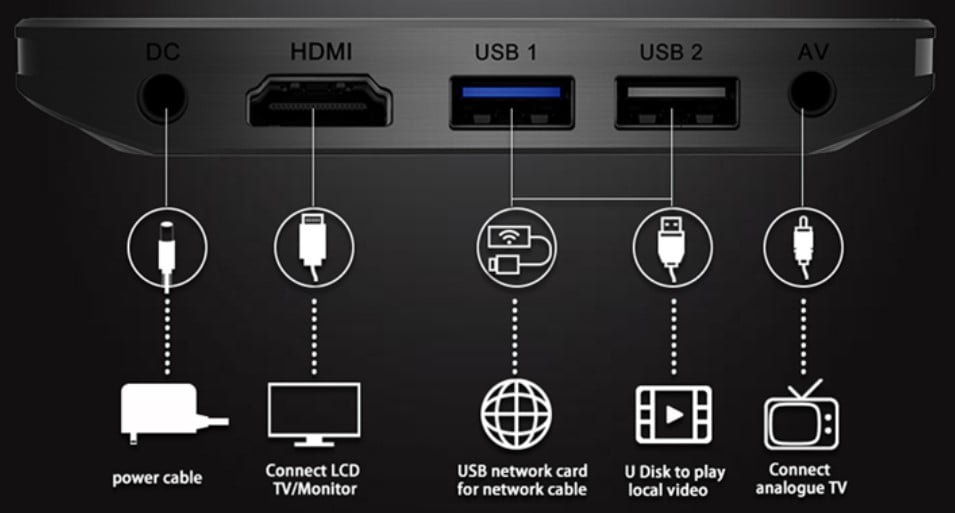 A nivel de conectividad inalámbrica parece que tenemos WiFi aC con antena interna y Bluetooth 4.0. Los conectores incluidos en este TV-Box son un lector de tarjetas microSD, una salida de vídeo HDMI 2.1, un puerto USB 2.0, un USB 3.0 y una salida de audio y vídeo analógica. El sistema operativo instalado es Android 8.1.