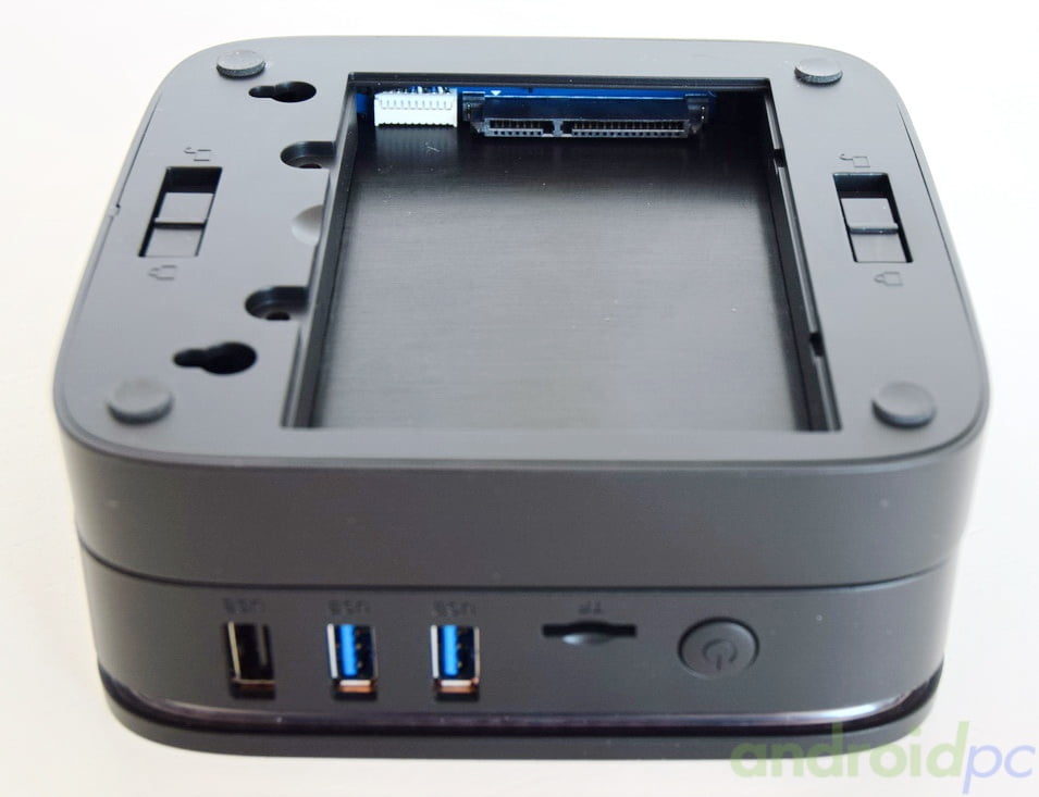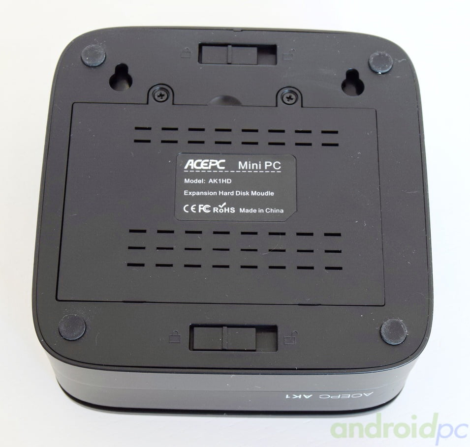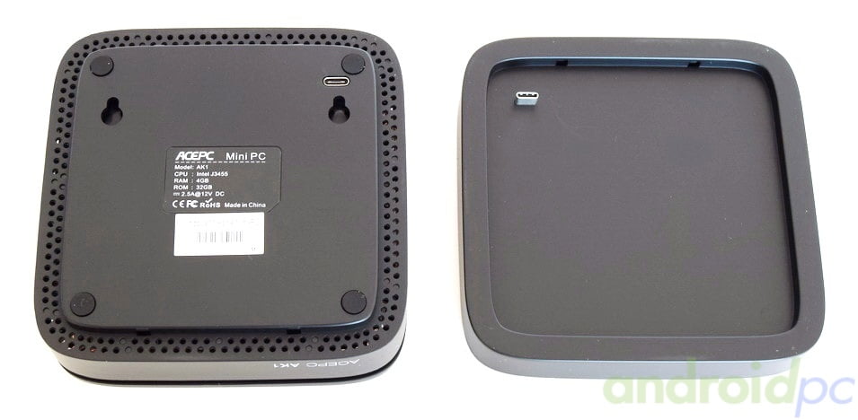 En la zona inferior del ACEPC AK1 tenemos cuatro patas de goma, los agujeros para colgar el miniPC en el soporte VESA, una trampilla que esconde la bahía de discos de 2,5″ y dos cierres que liberal el bloque del dock inferior como veremos.