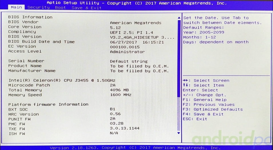 Podemos arrancar la BIOS del sistema pulsando repetidamente la tecla ESC o SUPR mientra reiniciamos el miniPC, la BIOS del sistema es la clásica de AMI con los menús en modo texto por los que podemos navegar usando el teclado, los ajustes avanzados nos dan pocas opciones de control.