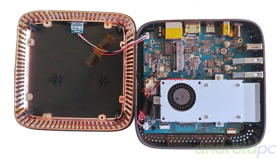 Si abrimos la caja del ACEPC AK1 podemos ver la placa base con el ventilador tipo blower que extrae el aire por un lateral, la tarjeta wifi tiene dos antenas pegadas a un lateral y por sorpresa encontramos una ranura para discos mSATA en la parte superior. La parte inferior no cuenta con ningún hardware destacable, la carcasa exterior dorada tiene una tira led en todo el perímetro