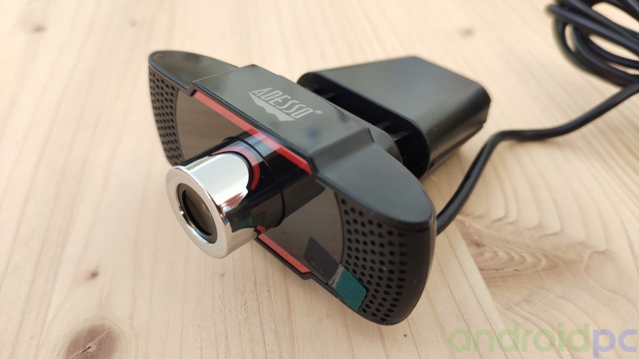 La cámara más potente ADESSO CyberTrack H5 tiene un diseño bastante clásico y en cada uno de los laterales esconde los micrófonos integrados. En la parte central tenemos el objetivo de la cámara detrás de un cristal de protección, en esta zona tenemos también un pequeño sistema para tapar la lente y ganar así privacidad total.