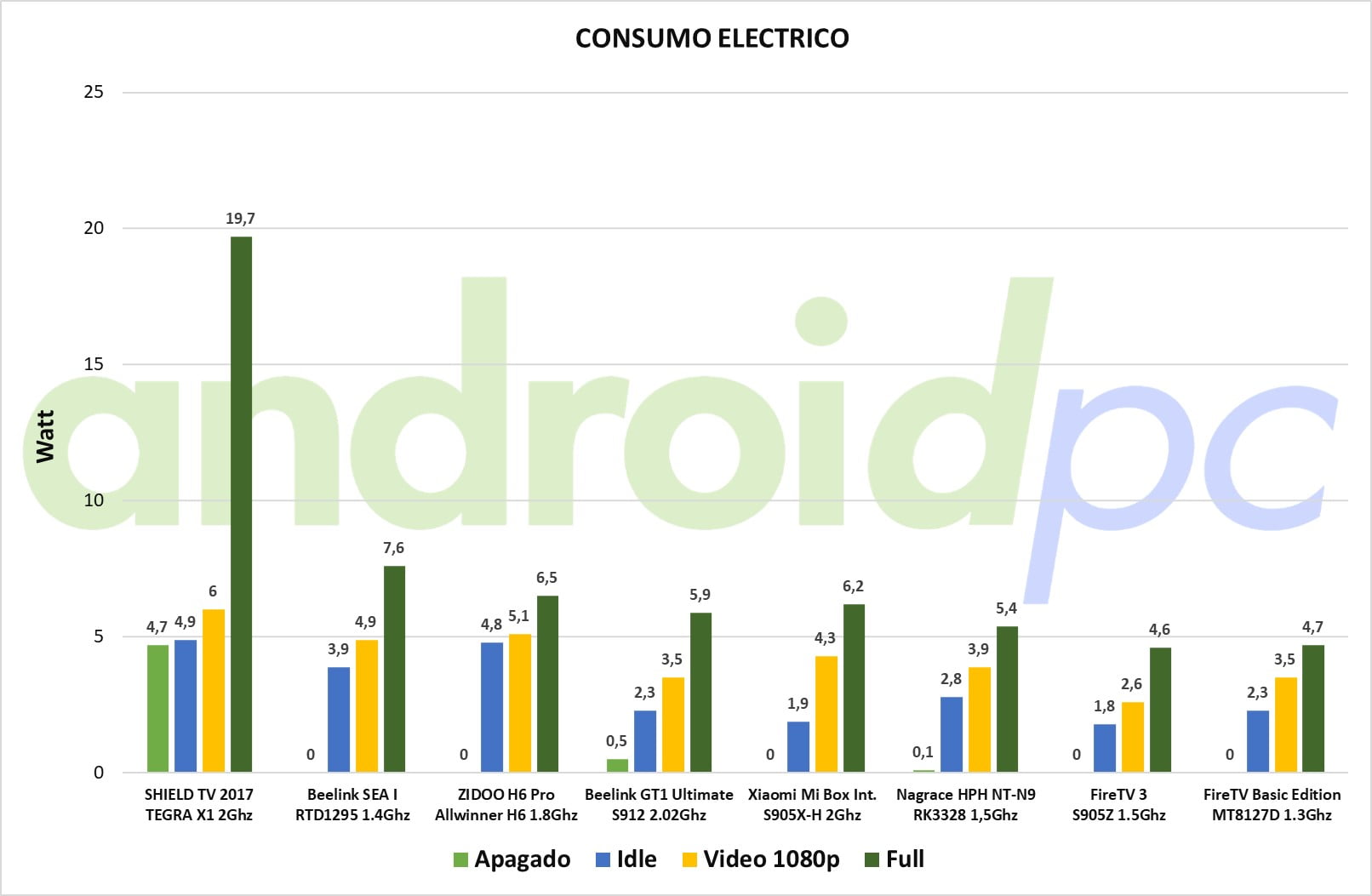 En cuanto al consumo eléctrico el Fire TV Basic Edition utilizando el SoC Amlogic MT8127D nos da unos resultados bastante contenidos en la línea de otros modelos similares, en máximo rendimiento el SoC llega a los 4,7 W de pico de consumo. La temperatura es baja en un uso normal, por lo esta que no afecta al funcionamiento de stick de Amazon.