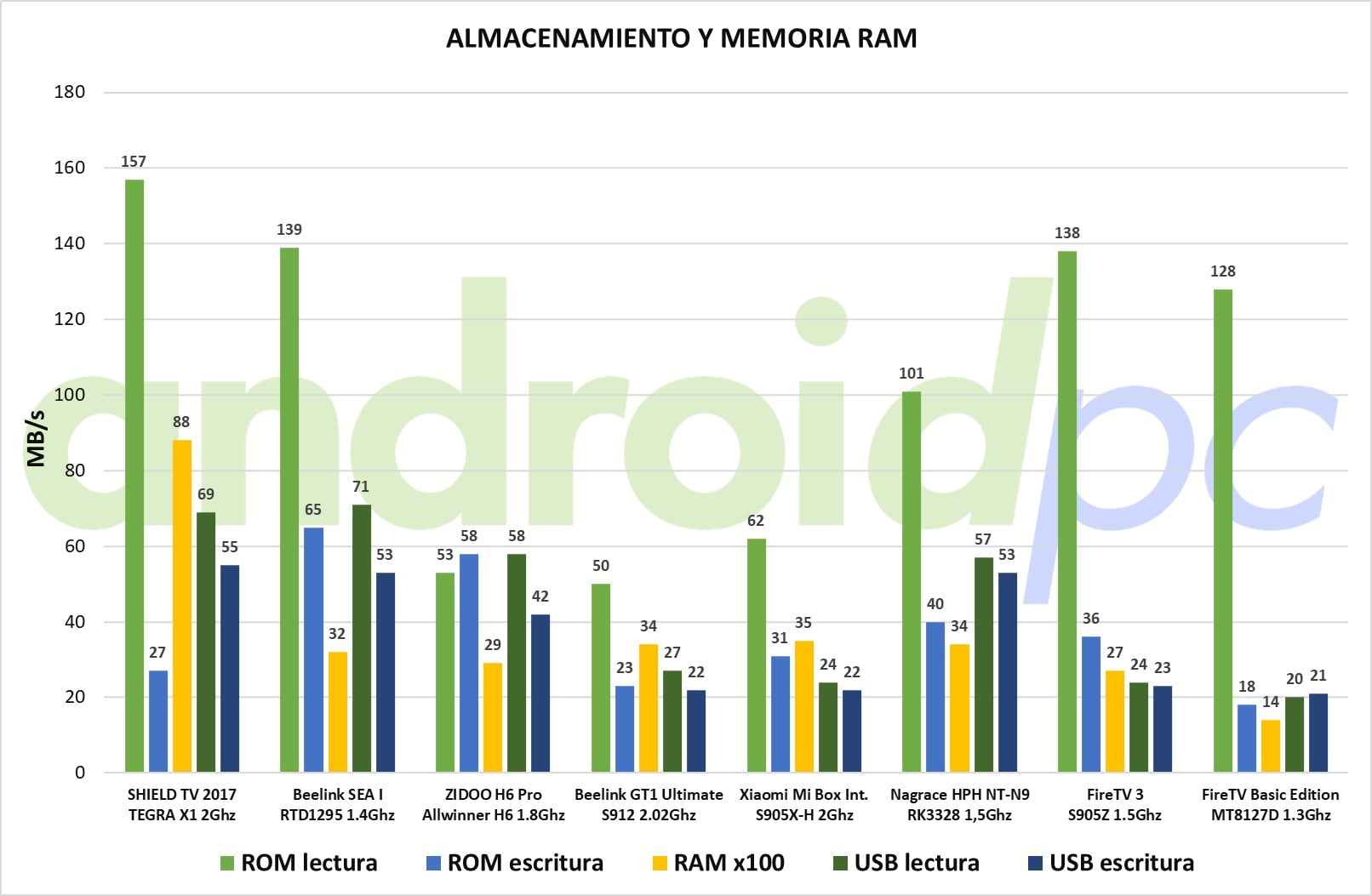 Realizamos nuestros test a la memoria y almacenamiento interno en el Fire TV Basic Edition usando el app SD bench que nos da unas cifras excelente como podemos ver, unos datos que se reflejan en lo fluido que se mueve el dispositivo. Este modelo al contrario que el Fire TV 3 si es compatible con NTFS y podemos ver unidades externas sin problemas.