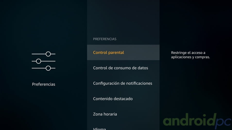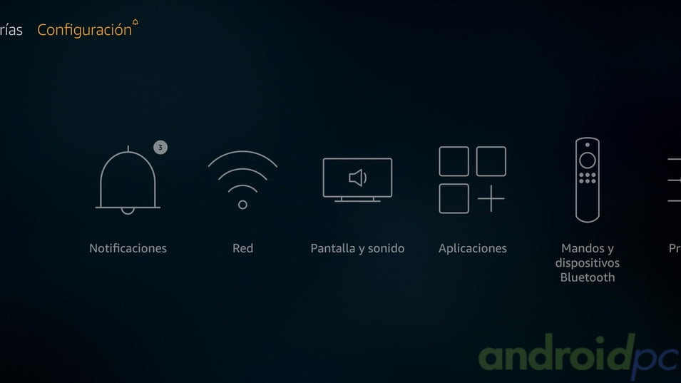 Los ajustes de Fire TV Basic Edition con FireOS son básicos y directos, tenemos un icono de notificaciones donde podemos leer avisos de apps y del sistema, ajustes de red, Pantalla y sonido, gestión de Aplicaciones, Mandos y dispositivos Bluetooth, Preferencias, Dispositivo, Accesibilidad, Ayuda y Mi cuenta donde gestionamos los datos de nuestra cuenta de Amazon.