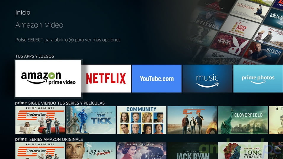 Conectamos a la corriente el Fire TV Basic Edition y el sistema se pone en marcha de forma automática, en el primer arranque tenemos un asistente de configuración que nos ayuda a conectar el mando Bluetooth en un primer paso, después tendremos que acceder con nuestra cuenta de amazon, si ya tenemos un otro dispositivo FireOS veremos como tenemos una lista de apps previas ya disponibles para descargar. En la primera pestaña denominada Inicio se agrupan en una primera fila los accesos directos que más usamos y la lista de apps instaladas que podemos reordenar de forma básica, más abajo tenemos todos los contenidos que nos ofrece Amazon. Este launcher por defecto no se puede cambiar de forma sencilla.