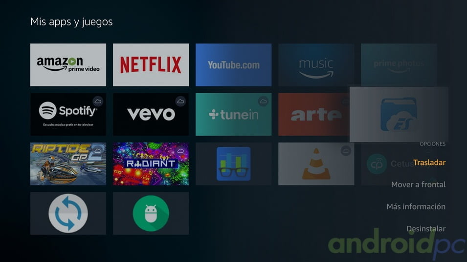 En el sistema FireOS se nos crean accesos directos tanto para apps diseñadas para Android TV como las de Android clásico, un punto interesante ya que nos simplifica la vida. Los app con el icono de la nube son apps que tenemos en nuestra biblioteca de apps de Amazon pero que aún no hemos descargado. Si pulsamos el botón menú del mando a distancia tenemos varias opciones, con la función mover podemos cambiar el orden de los apps que se muestran en la primera pantalla del launcher.