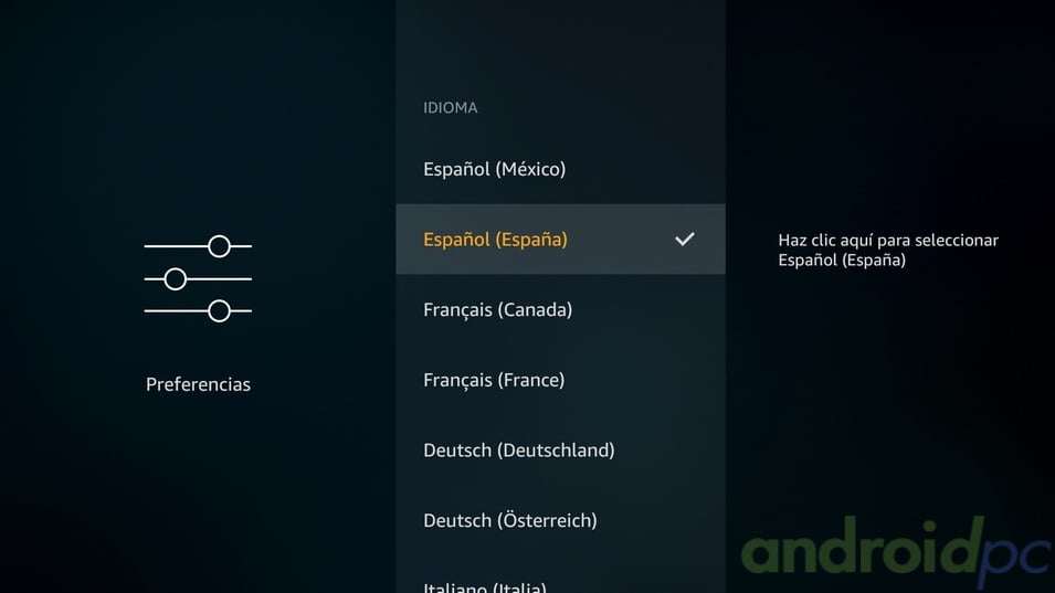 Dentro de lo ajustes de sistema podemos poner el idioma Español ya que desde hace unos meses tenemos una lista de idioma muchísimo más amplia que la que teníamos con FireOS 5.