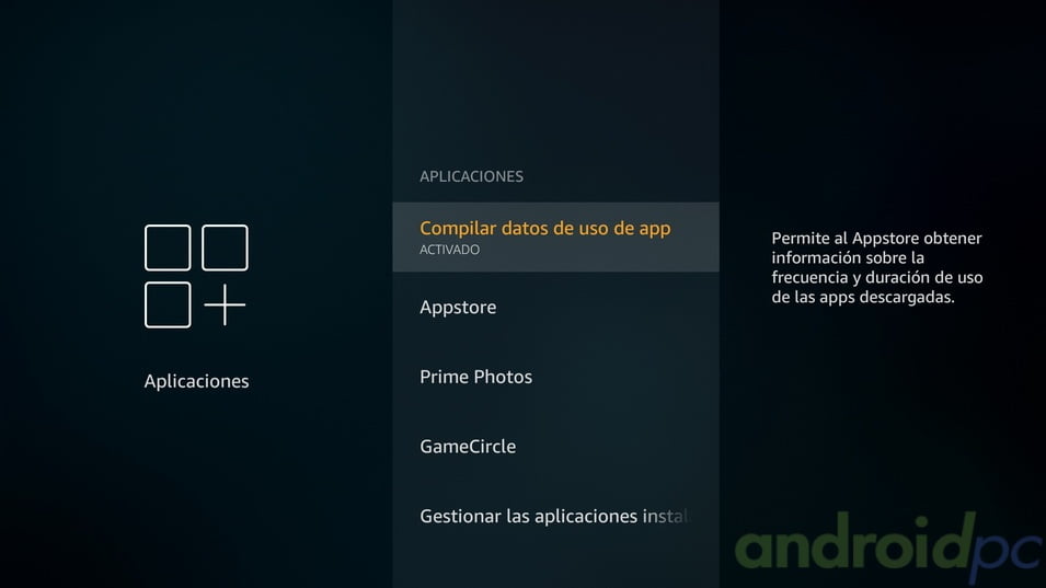 Dentro de Aplicaciones también tenemos opciones de nuestra cuenta de Appstore, Prime Photos, GameCircle y gestor de aplicaciones instaladas donde podemos desinstalarlas.