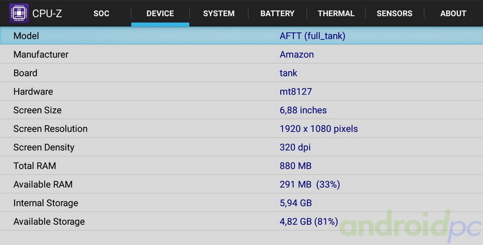 Como sabemos el sistema de FireOS es un fork (versión paralela) de Android clásico con versión 5.1.1, el sistema funciona a 32bit como es lo habitual en todos en los firmware con el SoC MediaTek MT8127D, el kernel es 3.10.54+ un poco antiguo pero correcto.