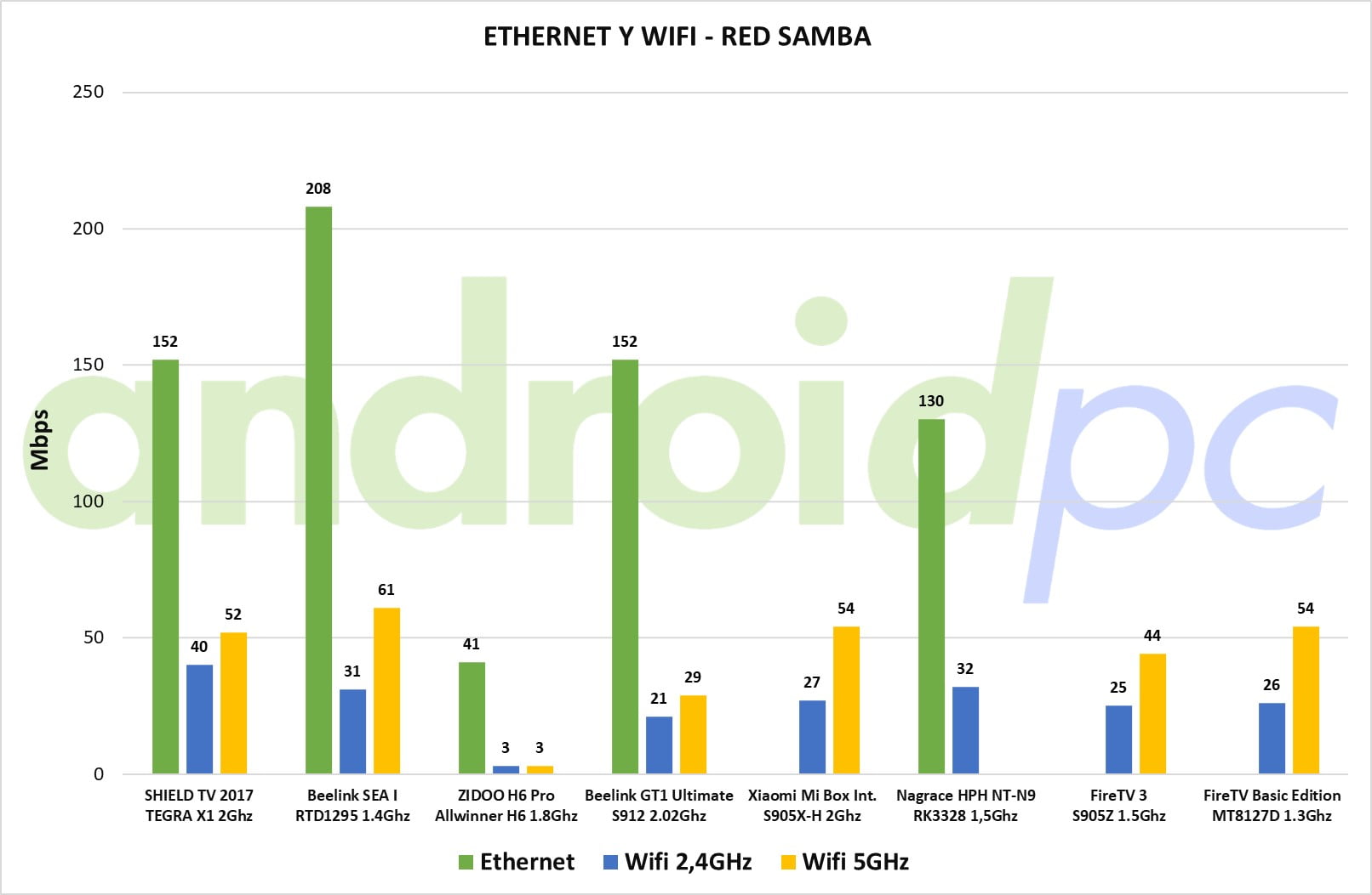 Dentro del Fire TV Basic Edition tenemos un adaptador inalámbrico Wifi aC de Doble Banda MIMO 2×2 con el hemos conectado con un Router ASUS RT-AC1200G+, un equipo de gama media. Realizamos transferencia de archivos sobre una red SAMBA y conectado mediante Wifi 2,4Ghz hemos logrado una velocidad de unos 26 Mbps, con la red de Wifi 5Ghz alcanzamos unos 54 Mbps. Unos resultados correctos en la banda 5GHz, en nuestro caso esta banda nos a dado algún problema de caídas con nuestro router.