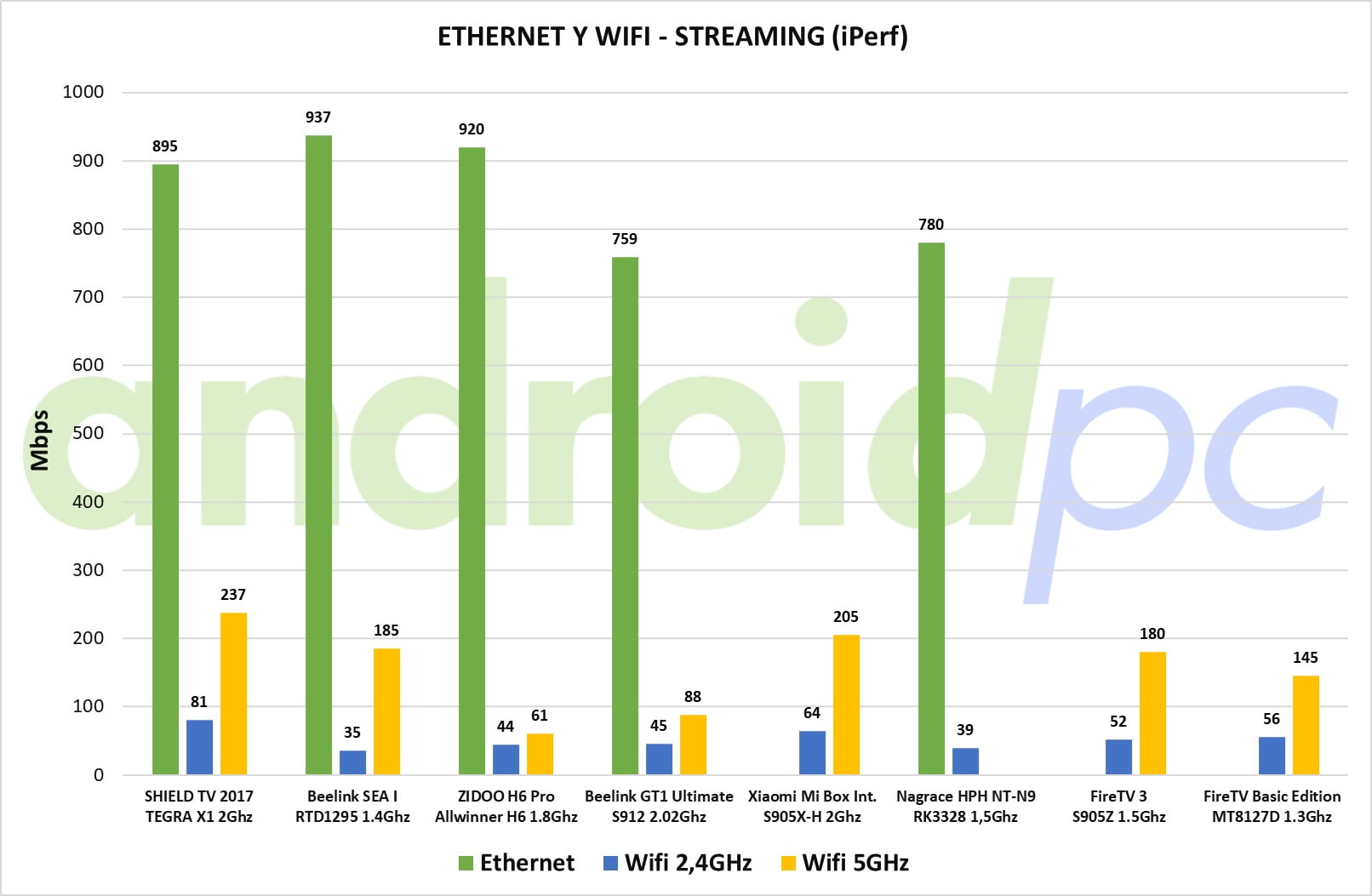 Poniendo a prueba los adaptadores de red en uso de streaming utilizamos la herramienta de medición iPerf con la que tenemos la velocidad máxima de conexión en cada tipo de red. Con esta cifra tenemos hasta dónde podemos llegar usando las conexiones disponibles, el rendimiento final dependerá de nuestro proveedor de internet, la velocidad contratada, la distancia de nuestra red wifi, cableado Ethernet y otros factores. Los resultados son usando el adaptador Wifi 5GHz que nos da buenas velocidades llegando hasta 145 Mbps.