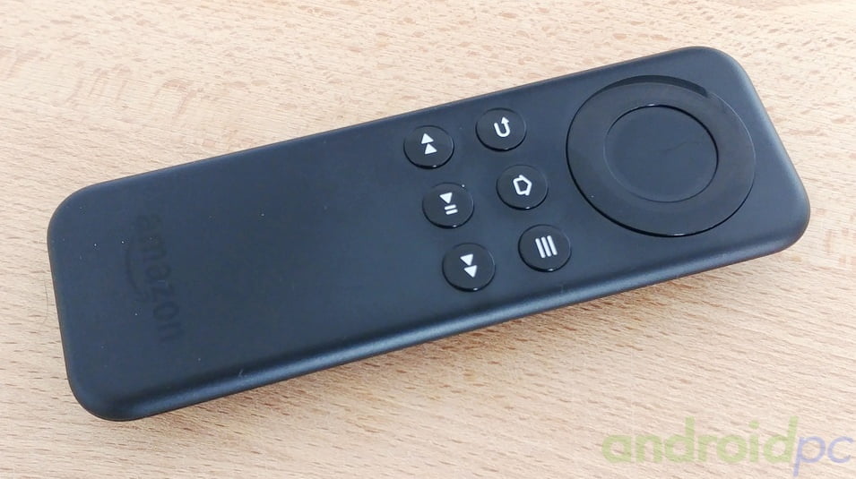 De serie con el TV-Box Fire TV Basic Edition tenemos el mismo mando a distancia del primer Fire TV, funciona mediante dos pilas AAA y se conecta por Bluetooth. En la parte superior tenemos el circulo con las clásicas funciones de cruceta y botón OK en el centro, abajo contamos con accesos directos de comandos Android, volumen y controles de reproducción.