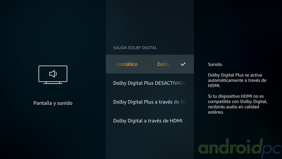 El Fire TV Basic Edition cuenta con un SoC MediaTek MT8127D, este es un procesador que oficialmente SI está licenciado para el uso de audio pass through para DD y DTS. Para la pruebas de sonido utilizamos nuestro receptor AV Yamaha RXV-577 y comprobamos que en el dispositivo disponemos de audio pass through para DD y DTS hasta 5.1 aunque el sistema no nos muestra información concreta de la salida de audio, parece que si es compatible.