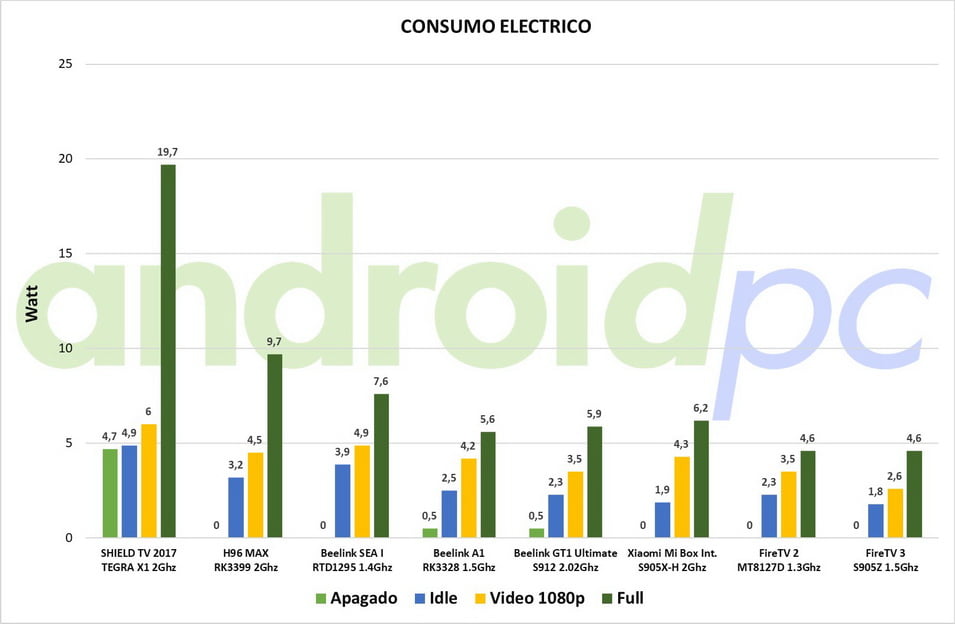 En el apartado de consumo eléctrico el Fire TV 3 utilizando el SoC Amlogic S905Z nos da unos resultados bastante contenidos en la línea de otro SoC similares, en máximo rendimiento el SoC llega a los 4,6 W de pico de consumo. La temperatura es baja en un uso normal, por lo esta que no afecta al funcionamiento de stick de Amazon.