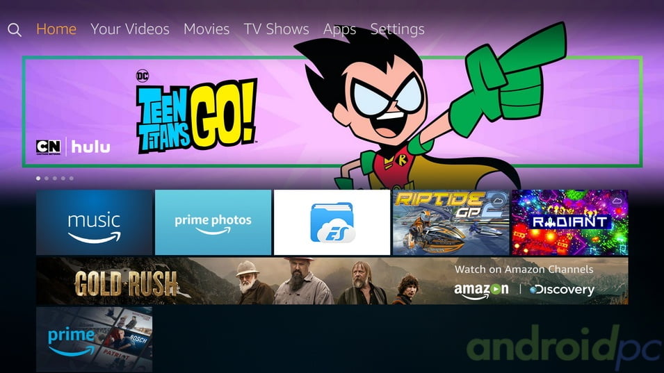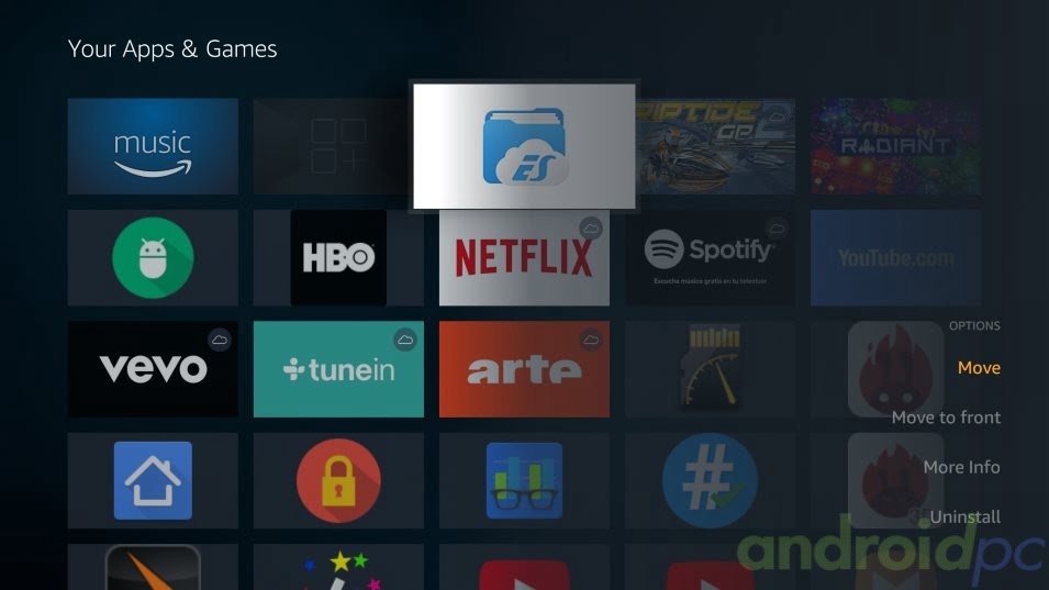 Al contrario que en Android TV en el sistema FireOS se nos generan accesos directos tanto para apps diseñadas para Android TV como para Android clásico, un punto interesante ya que nos simplifica la vida. Los app con el icono de la nube son apps que tenemos en nuestra biblioteca de apps de Amazon pero que aún no hemos descargado. Si pulsamos el botón menú del mando a distancia tenemos varias opciones, con la función mover podemos cambiar el orden de los apps que se muestran en la primera pantalla del launcher.