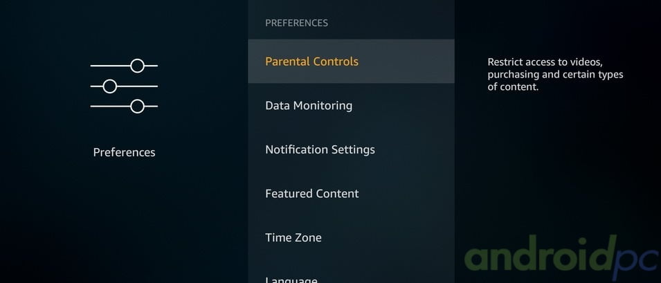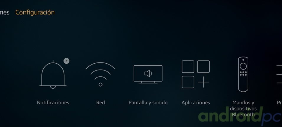 Los ajustes de Fire TV 3 con FireOS son muy sencillos, tenemos un icono de notificaciones donde podemos leer avisos de apps y del sistema, ajustes de red, Pantalla y sonido, gestión de Aplicaciones, Mandos y dispositivos Bluetooth, Preferencias, Dispositivo, Accesibilidad, Ayuda y Mi cuenta donde gestionamos los datos de nuestra cuenta de Amazon.