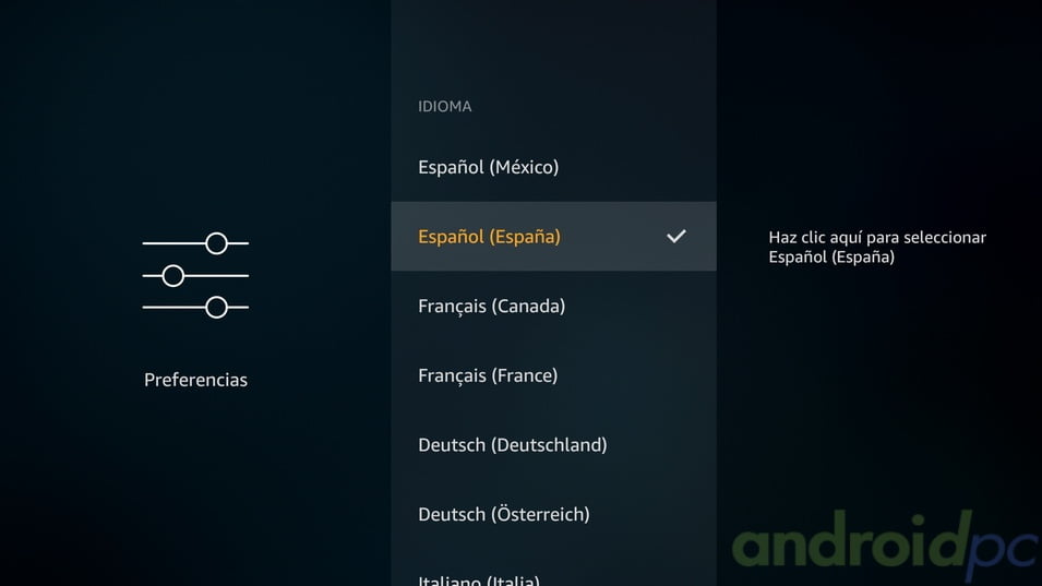 Dentro de los ajustes de sistema podemos poner el idioma Español ya que desde hace unos meses tenemos una lista de idioma muchísimo más amplia que la que teníamos con FireOS 5.