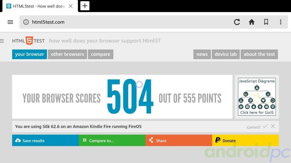 Realizamos test de rendimiento sobre el Fire TV 3 usando un navegador donde no tenemos problemas abriendo un gran número de pestañas gracias a sus 2 GB de RAM DDR3. Los contenidos se reproducen en HTML5 correctamente, podemos probar el navegador de la propia Amazon denominado Silk instalandolo desde el APK porque aún no está liberado fuera de los EEUU.