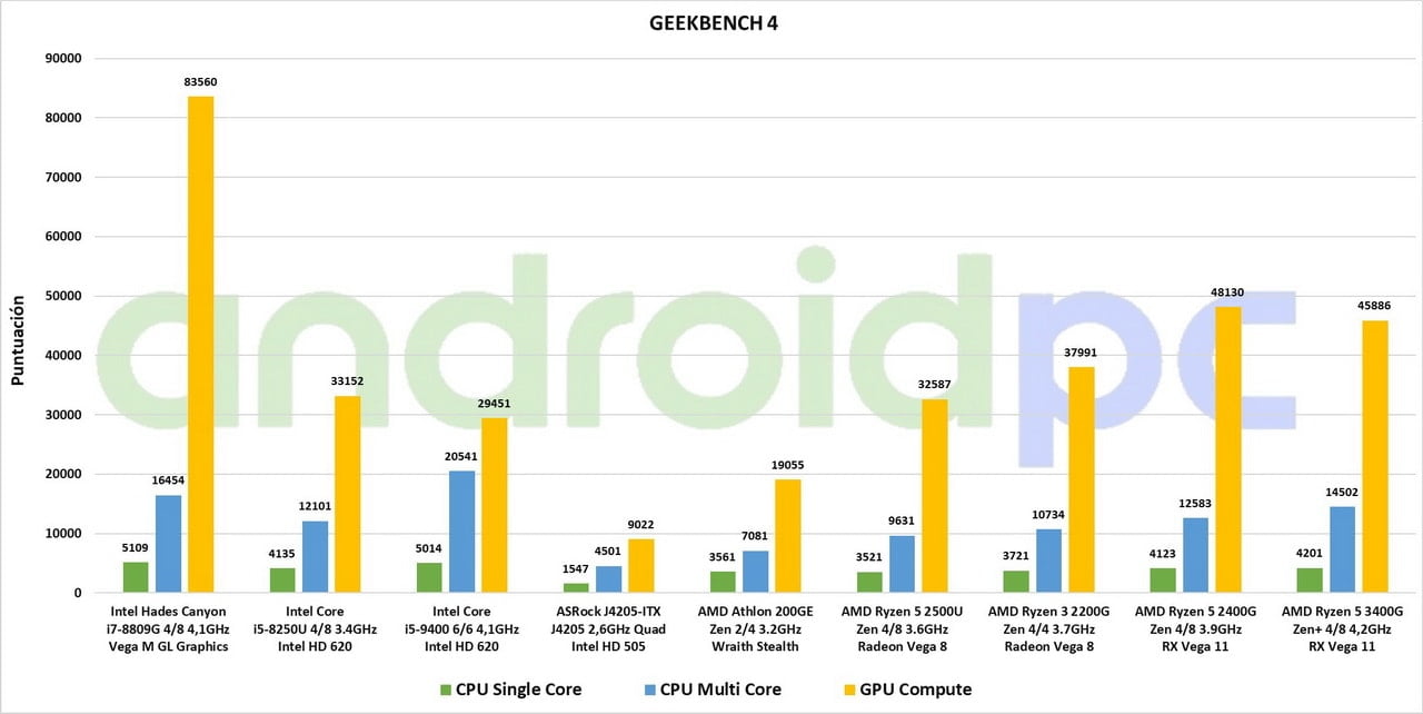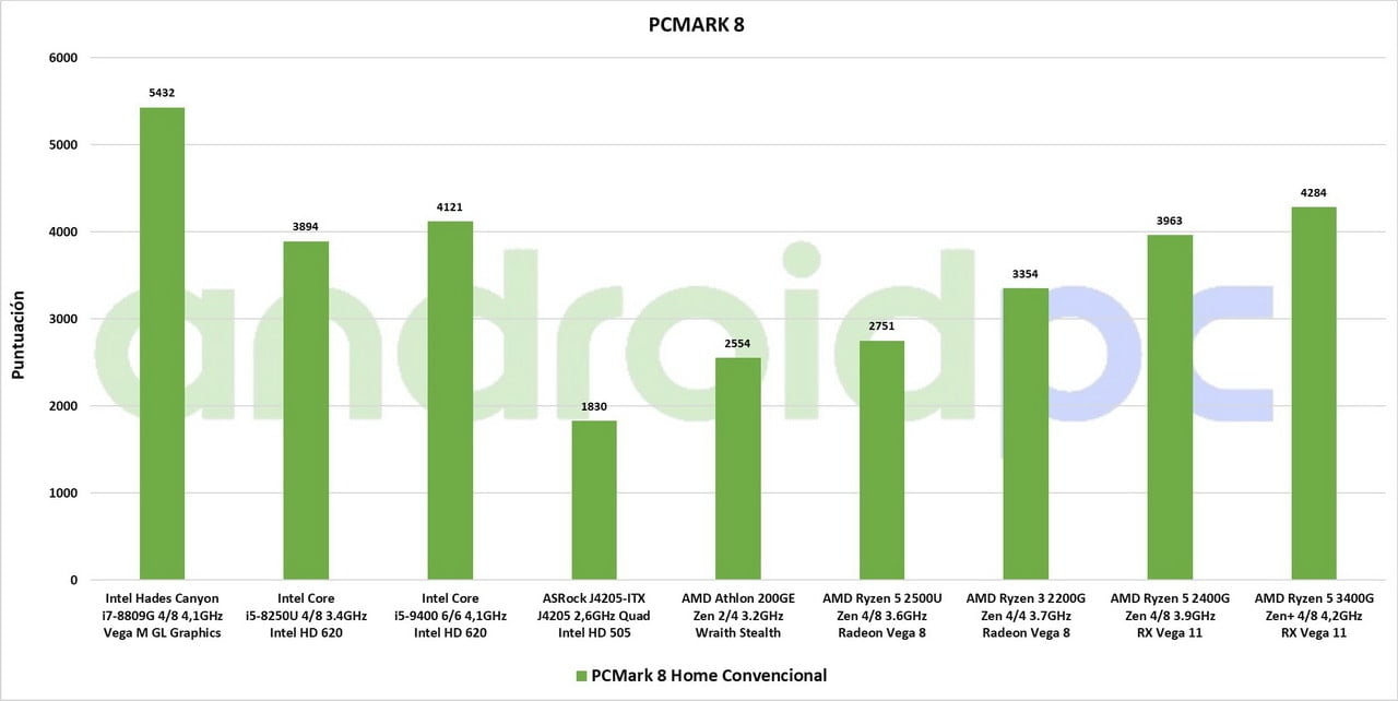 La nueva APU AMD Ryzen 5 3400G con cuatro núcleos CPU Zen+ a 12nm y ocho hilos de ejecución hasta 4.2GHz, dispone de una GPU Radeon Vega 11 con una velocidad máxima de 1GHz, como hemos visto en sus especificaciones muy continuista respecto a la anterior APU AMD Ryzen 5 2400G. El rendimiento general es muy bueno, hay que tener en cuenta que estamos antes un procesador con un consumo de solo 65W TPD y que cuenta con una GPU integrada bastante potente, todo un rival para los modelos de gama media de Intel con una GPU integrada muy inferior.