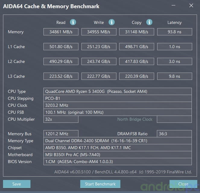 Realizamos pruebas de esta nueva APU AMD Ryzen 5 3400G contamos con 16 GB de memoria GSkill Flare X DDR4 3200MHz configurada en Dual Channel, las cifras que tenemos como podemos ver se quedan en unos valores correctos e igualan a las APU Ryzen superiores. La velocidad en Dual Channel como vemos en las cifras son correctas, una velocidad que es critica para sacar el maximo rendimiento a la GPU Vega integrada, un punto importante ya que no podemos hacer mucho Overclock a la CPU.