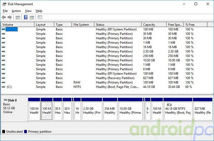 En la memoria interna del CHUWI HiBox Hero como es habitual en todos los dispositivos Dual Boot tiene un gran número de particiones, las cuatro últimas son para Windows y el resto son particiones para Android. En Windows nos quedan unas 31GB libres de las 44GB totales destinadas a este sistema.