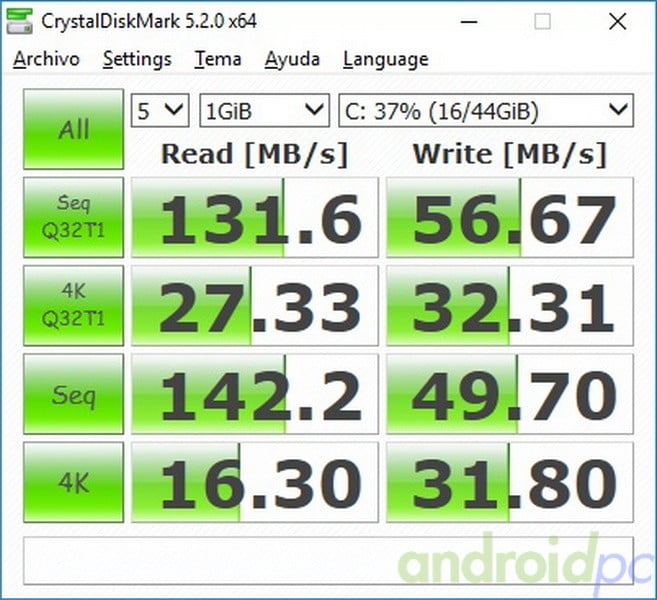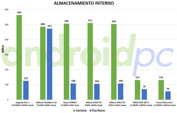 Comprobamos la velocidad del almacenamiento interno del CHUWI HiBox Hero realizando nuestras habituales pruebas de rendimiento y observamos que este modelo tiene unas velocidades correctas.