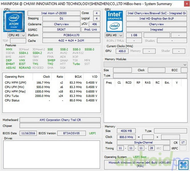 El miniPC CHUWI HiBox Hero cuenta con el nuevo SoC Quad Core Intel Intel Atom x5-Z8350 Quad Core un modelo que funciona a una velocidad normal de 1.44GHz y un modo turbo puede llegar hasta los 1.92GHz según especificaciones aunque nuestras pruebas de stress hemos podido ver que no pasamos de 1.66GHz. Este modelo integra una GPU Intel HD Graphics 400 Gen8 con 12 Unidades de ejecución y que incluye soporte parcial para decodificación por hardware del codec H.265 y tiene soporte de resoluciones 4K a 30fps. La velocidad de trabajo normal de la GPU es 200Mhz aunque puede llegar puntualmente hasta los 500MHz cuando se le exige más potencia, como veremos una GPU superior a la de la anterior generación, este es el cambio más evidente respecto a los anteriores modelos de Intel.