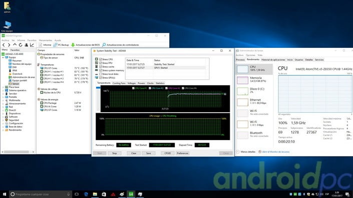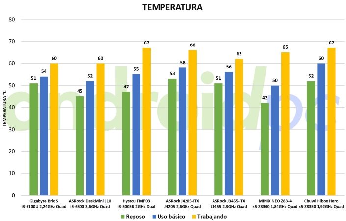 Si formamos el sistema en una prueba de rendimiento extremo la temperatura sube a unos 84ºC y la velocidad se queda en unos 1,6GHz, por lo demás el sistema no pasa de esta temperatura que aunque parezca excesiva no llega a los 90ºC que puede soportar este SoC antes de apagarse.